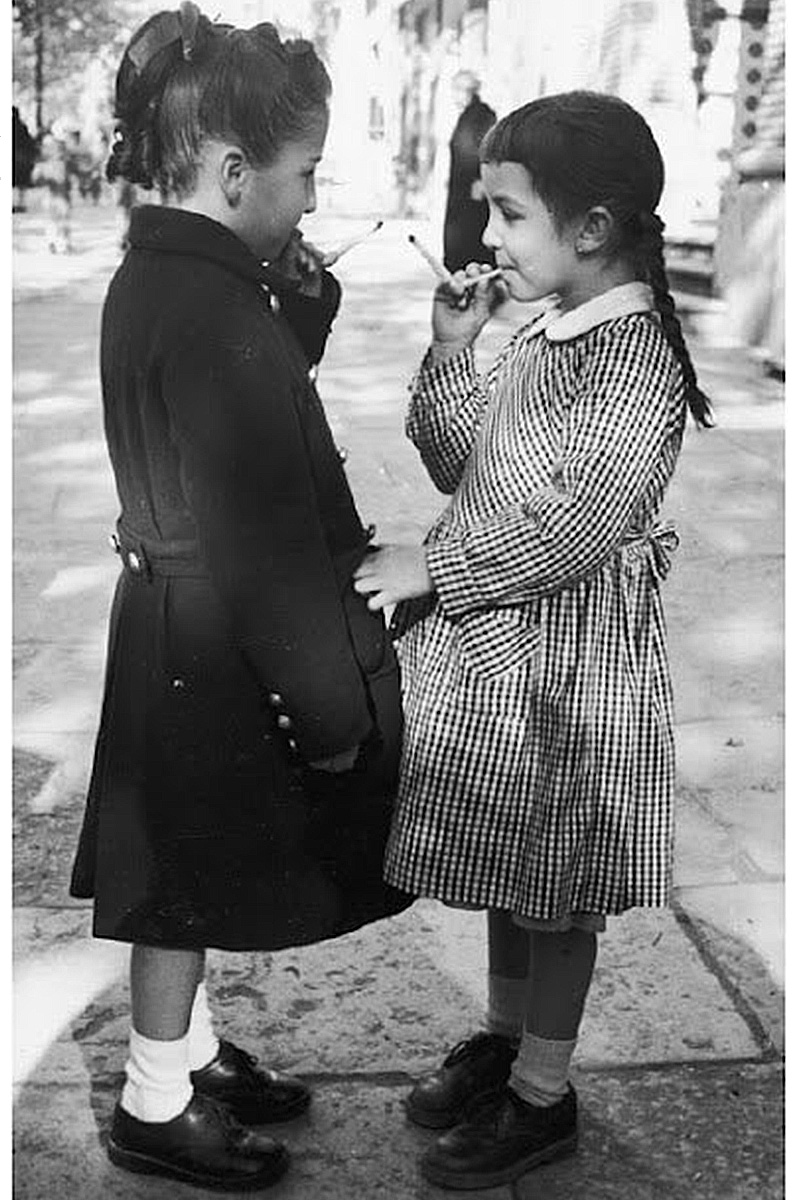 Un grup de joves fumant amb fruïció cigarretes de matafaluga o altres herbes aromàtiques (1954). Foto: Arxiu Fidel Fita-Jaume CodoñésDues nenes amb la seva cigarreta. Foto: Arxiu Fidel FitaEls nens tenen llicència per fumarAcompanyats pels seus paresLa cercavila